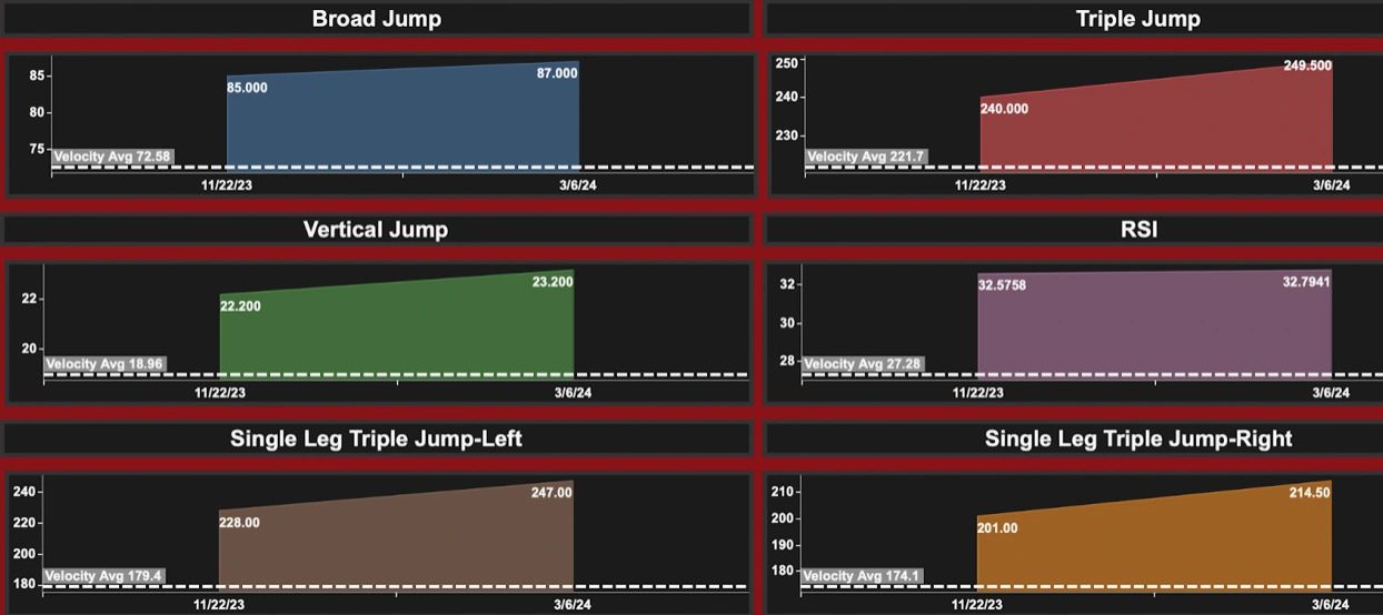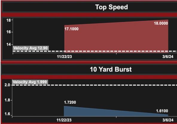 Brian increased his top running speed by 1 MPH from 17 MPH to 18 MPH. Thus, allowing him to decrease his 10 Yard Dash time from 1.72 seconds to 1.61 seconds. Both of these metrics are well above the average for athletes his age.