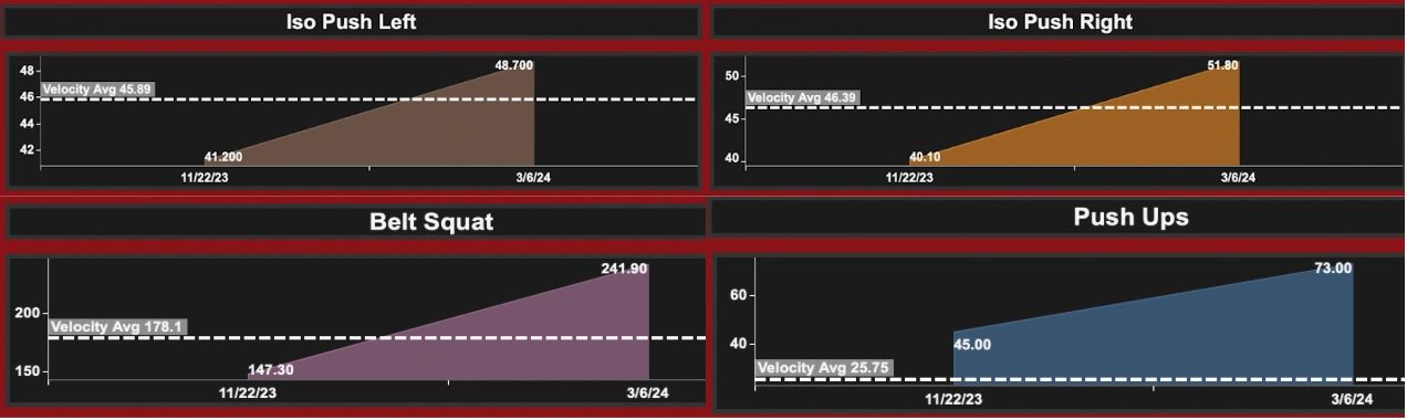 Lastly, his at home lifting program most definitely yielded in strength gains. His upper and lower body strength metrics increased on tests such as: push ups, upper body ISO push, and belt squat ISO. During this time, Brian was able to take one of his lowest hanging fruits (ISO push and belt squat = below average) and turn it into a strength. (ISO push and belt squat = above average)
