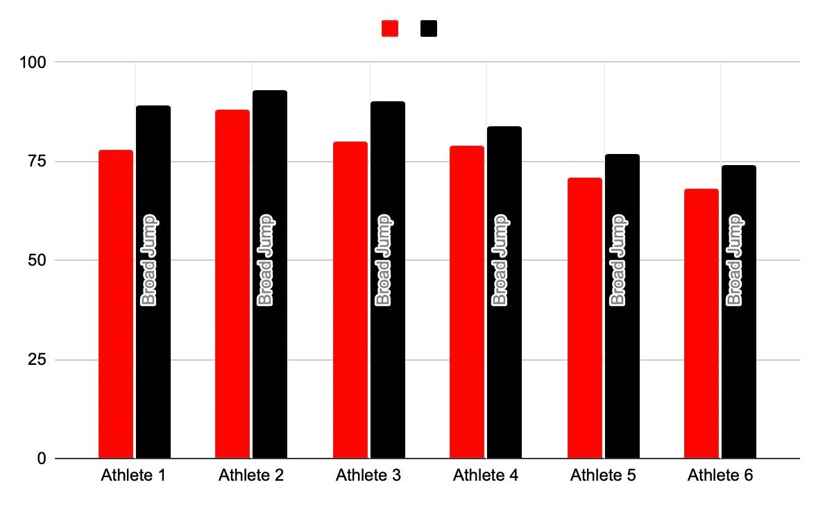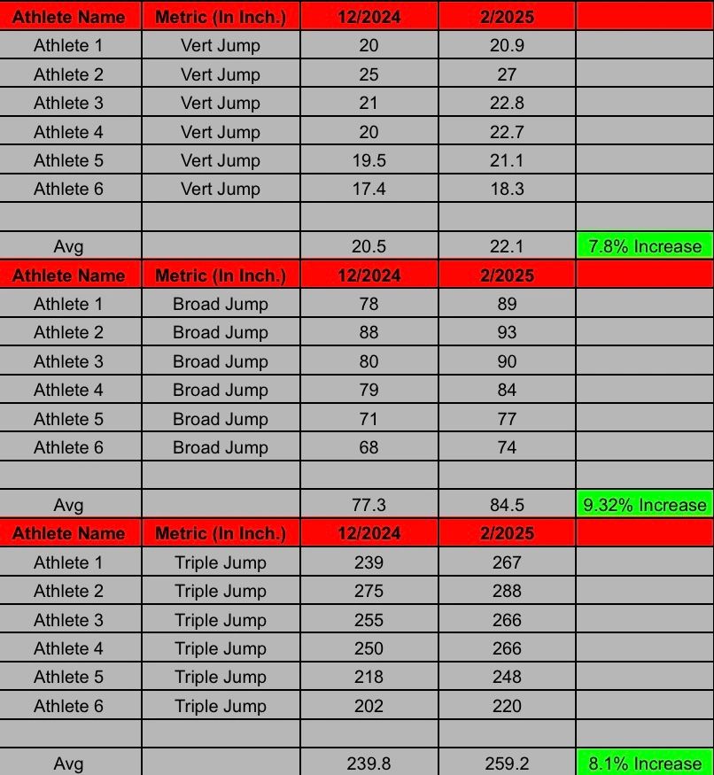In the images below we will highlight the increases in lower body power. Through our testing and retesting of the vertical jump, broad jump, & triple jump, EVERY SINGLE ATHLETE that tested improved their metrics on EVERY SINGLE POWER TEST!!!