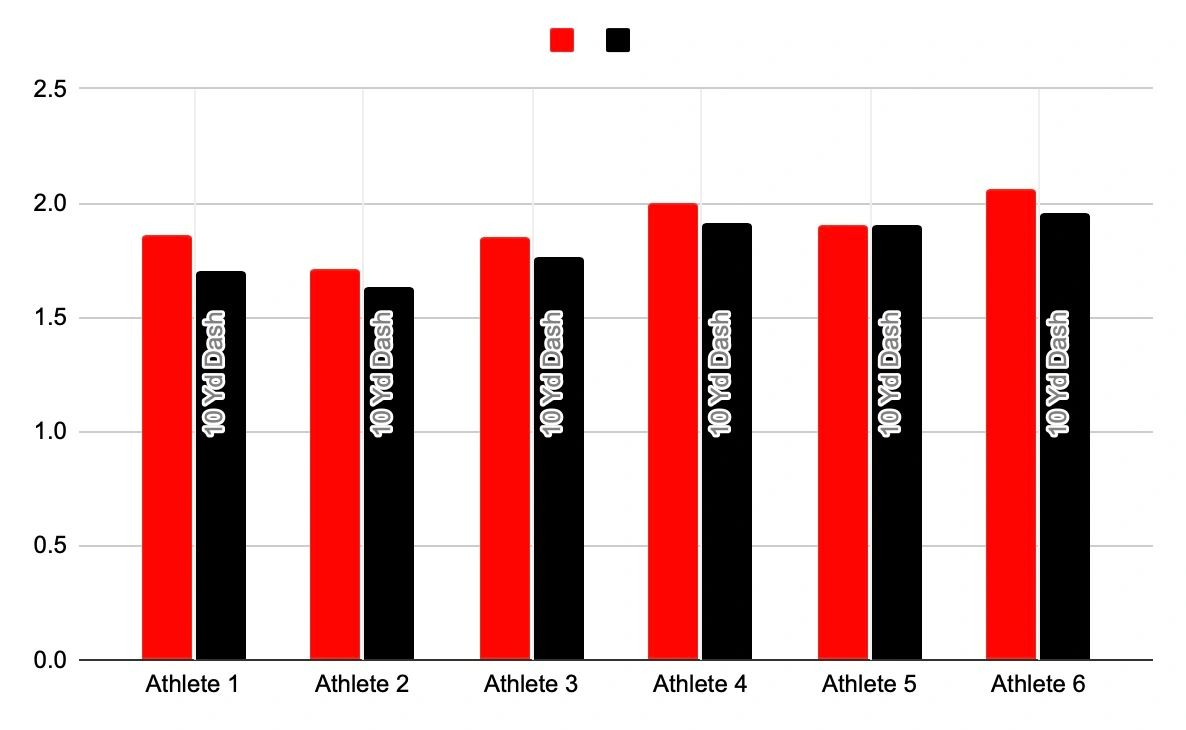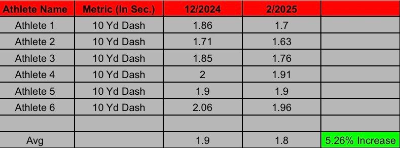 Through our testing & retesting of the 10 Yd Dash we can see that nearly every athlete that tested improved their time, resulting in an overall team average increase of 5.26%.